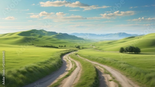 "Natural Concept: Road Through Grassfield in a Border Landscape, Isolated Grassland Outdoors Against Transparent Background"