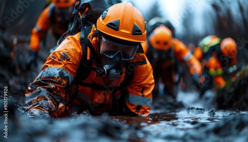 Natural disaster aftermath with rescue workers in action, Historical, Earthy tones, Photography