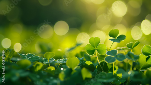 Natural green background with fresh three-leaved shamrocks. St. Patrick's day holiday symbol. Top View, green background clover leaf bokeh lights defocused, Ai generated image