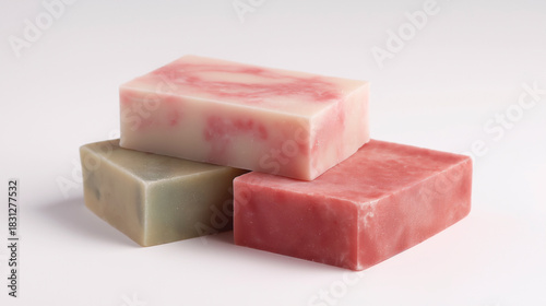 Natural Handmade Soaps. Three rectangular handmade soaps stacked on a plain white background. Generative AI
