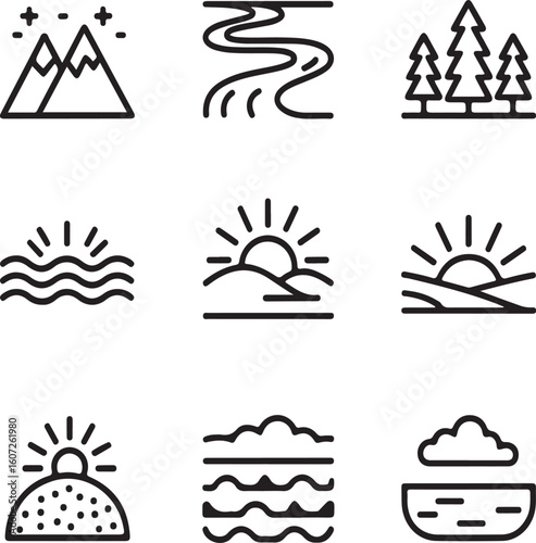 Natural Landscape Line Icons – Mountains, Rivers, Forests, and Scenic Elements