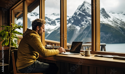 mountain, sea, laptop, working, person, view, wood, house, traditional, office, natural, honed, vista, remote, work, nature, balance, workspace, harmony, window, indoor, adult, coastal, hillside, calm, sharpened, solitude, freelance, career, room, leisure, backlit, interior, wooden, structure, rustic, productive, job, business, sitting, home, cyberspace