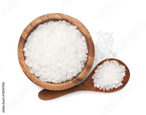 Natural salt in wooden bowl and spoon on white background, top view
