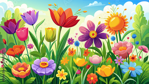 Nature outdoors bursts with colorful meadow flowers during spring summer season. Set against a white background, each petal and leaf is rendered in semi-realistic style, ideal for bright, cheerful