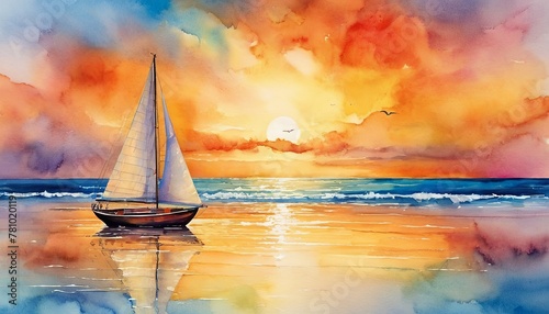 watercolor, painting, sunset, high tide, gold, sand, calm, sea, coloured, cloud, ray, light, sailing, boat, fish, shimmering, vibrant, beautiful, painterly, detailed, textural, artistic, nature, scenery, landscape, seascape, twilight, dusk, evening, sky, horizon, coast, shore, beach, wave, ocean, marin, nautical, maritime, yacht, sail, water, sailboat, ship, summer, travel, vacation, sport