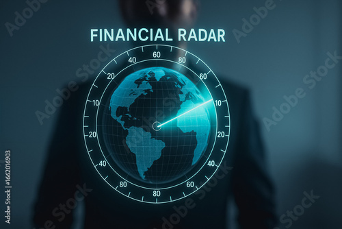 Navigating the Financial World: A visual of a sophisticated businessperson standing before a dynamic graphic radar with a luminous globe, symbolizing the pursuit of navigating financial terrain