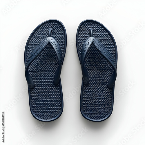 Navy blue flip flops on a white isolated background, perfect for summer clothing and beachwear.