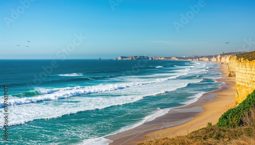 Nazare North Beach features vibrant blue, foamy waves, ideal for water sports enthusiasts