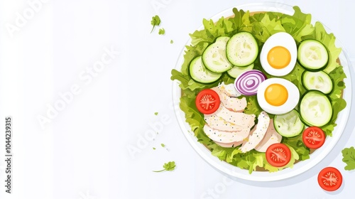 salad, chicken, egg, tomatoes, lettuce, bowl, anime, flat, colours, white, background, onion, ring, cucumber, spear, cherry, egg, white, neat, arrangement, healthy, food, artistic, cartoon, concept, clean, minimal, illustration, vibrant, fresh, organic, colourful, vegetable, diet, meal, creative, composition, aesthetic, vegetarian, wholesome, alimentary, japanese, style, modern, appetising, balanced, design, delicious