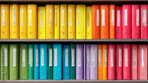 Neatly organized rows of colorful ring binders on two shelves, showcasing a spectrum of vibrant colors for office organization