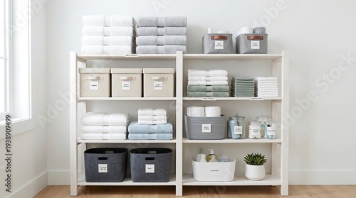 towel, neat, tidy, organisation, interior design, home decor, lifestyle, domestic, housekeeping, clean, minimalist, modern, domesticity, shelf, container, box, textile, folded, stacked, white, grey, beige, home interior, space saving, residential, orderliness