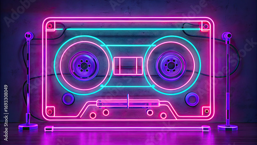 Neon cassette nostalgia of the 90s audio cassette concept. A neon cassette tape glowing in vibrant colors for retro appeal.