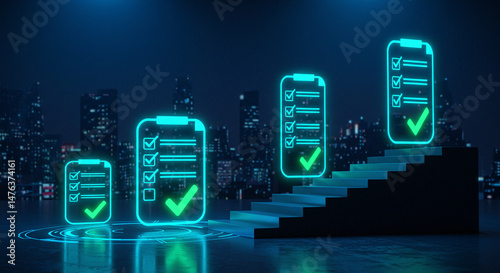 checklist, progress, step, completion, task, list, success, planning, organisation, management, tick, check, clipboard, neon, glowing, futuristic, city landscape, night, urban, achievement, goal, strategy, business, development, growth, skyline, building, architecture, modern, digital, technology, future, concept, abstract, illustration, diagram, presentation, report, datum, information, target, objective, deadline, efficiency, productivity, schedule, agenda, ranking