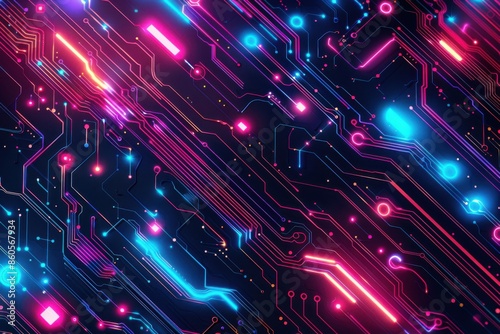 Neon circuit design on dark blue background - innovative technology concept with glowing integrated circuit pattern - illuminated electronics art piece