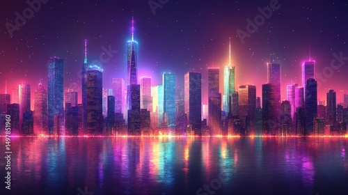 city, skyline, night, neon, water, urban, building, light, downtown, metropolis, architecture, skyscraper, city landscape, modern, vibrant, colourful, dark, illuminated, glowing, futuristic, evening, panorama, landscape, river, sea, ocean, bay, harbor, coast, waterfront, travel, tour tourism, business, finance, lifestyle, entertainment, party, celebration, festival, digital, abstract, art, design, background, wallpaper, banner, poster, header
