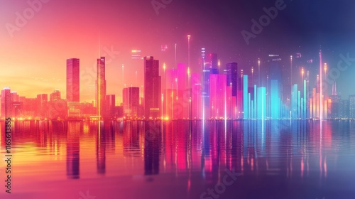 city landscape, neon, light, skyline, building, water, urban, night, digital, futuristic, abstract, glow, illuminated, architecture, modern, technology, metropolis, bright, high-coloured, colourful, graphic, design, art, style, fantasy, dream, scene, scenery, landscape, background, illustration, concept, future, progress, growth, energy