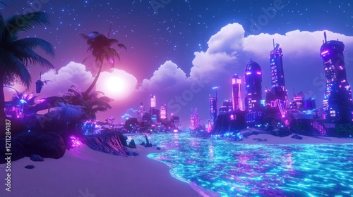 beach, city, futuristic, tropical, sunset, neon, night, sky, water, ocean, palm, tree, building, light, purple, pink, blue, fantasy, digital, art, artwork, illustration, scene, landscape, wave, sand, glowing, vibrant, colourful, paradise, dreamlike, imaginary, retro, 80s, aesthetic, coastline, horizon, cloud, star, sea, shore, stylish, modern, fantastic