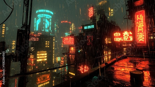 city landscape, rain, night, neon, light, building, futuristic, urban, street, wet, dark, drop, modern, skyscraper, glow, illuminated, rainwater, metallic, grimy, gloomy, red, orange, yellow, blue, purple, steel, architecture, technology, city, life, landscape, scene, metal