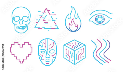 neon, icon, futuristic, digital, skull, flames, eye, triangle, nubes, mask, cube, line, glow, tech, modern, symbol, grid, science fiction, abstract, bright, vibrant, pink, blue, high technology, virtual, stylish, minimalist, unique, innovative, futurism, aesthetic, trendy, edgy, interactive, led, crispy, design, pictogram, interface, set, collection, visible, imagery
