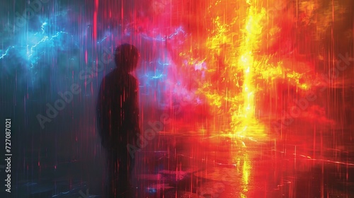 neon, divide, red, blue, contrast, silhouette, urban, wet, glow, mystery, night, aglow, abstract, street, water, futuristic, observer, vibrant, shadow, enigmatic, atmospheric, mood, light, technology, datum, illustration, business, design, concept, music, digital, love, science, art, disco, people, cyberspace, aurora