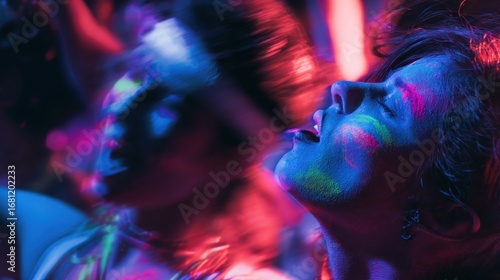 festival, music, neon, light, party, dance, club, nightlife, concert, energy, youth, vibrant, colours, glow, face, paint, woman, girl, people, crowd, motion, blur, movement, abstract, dynamic, expression, ecstasy, excitement, joyful, passionate, intense, high-coloured, bright, red, blue, purple, green, photo, portraiture, night