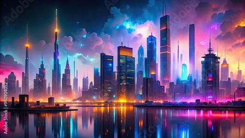 Neon Metropolis urban landscape glowing neon lights vibrant colors futuristic cityscape reflections misty night atmosphere abstract moody mysteries