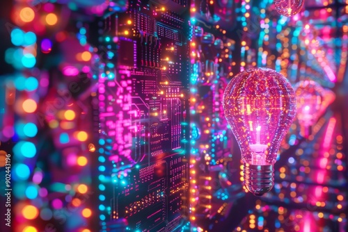 Neon Pink Brain Light Bulb in Digital Network Concept of Advanced Technology Intelligence and Bright Ideas in a High Tech Setting