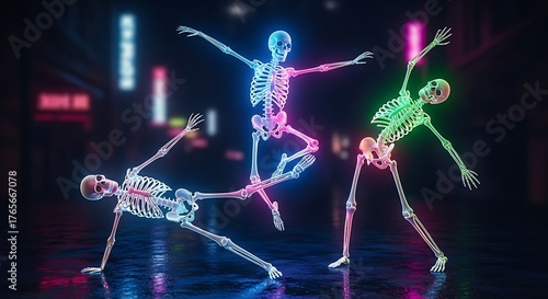 skeleton, neon, dance, street, city, night, vibrant, colourful, glowing, bone, anatomy, halloween, party, skittish, fun, celebration, urban, nightlife, illuminated, light, dark, fantasy, surreal, artistic, creative, render, digital, modern, contemporary