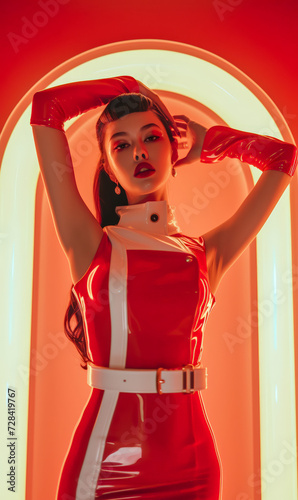 latex, woman, neon, red, fashion, futuristic, confident, bold, seductive, alluring, stylish, vibrant, beauty, model, retro, vintage, pin-up, glamour, sensual, powerful, attitude, edgy, cool, modern, science fiction, nightlife, photoshoot, studio shot, portrait, female, glove, arch, lighting, red dress, dominatrix, dress, lady, vector, hair, christmas, illustration, costume, children, style, face