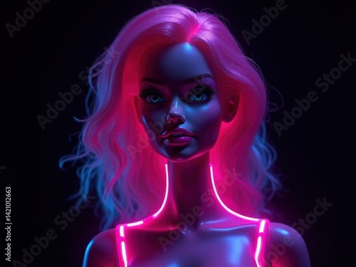 neon Woman with pink hair and a necklace is shown in a neon light. The image has a futuristic