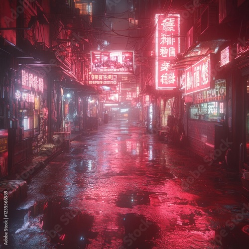 night, city, alley, street, neon, light, rain, wet, dark, futuristic, asian, urban, reflections, red, pink, glow, shadow, technology, atmosphere, mood, mysterious, vibrant, building, signs, chinese, japanese, korean, architecture, lane, pathway, alleyway, grunge, modern, abstract, graphic, design, illustration, digital, art, scene, view, perspective, background, texture