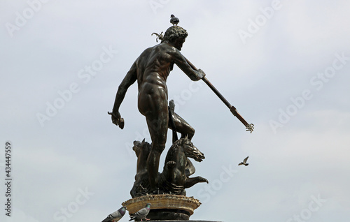 Neptune's sculpture with pigeon - 17th century historic fountain in Long Market, Gdansk, Poland