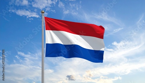 flag, holland, red, white, blue, horizontal, national, identity, symbol, country, europa, tricolour, pride, heritage, culture, waving, motion, fabric, texture, minimal, clean, bold, vibrant, patriotic, official, banner, oneness, representation, state, government, international, diplomacy, visual, composition, elegant, simple, classic, iconic, isolated, background, aesthetic