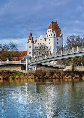 Neues Schloss und Bayerisches Armeemuseum mit Donausteg und Wasserspigelung in der Donau, Ingolstadt, Oberbayern, Bayern, Deutschland