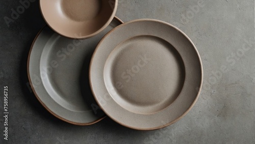 Neutral beige tableware with copy space on gray concrete background, top view, Scandinavian-style plates mockup for business brand template