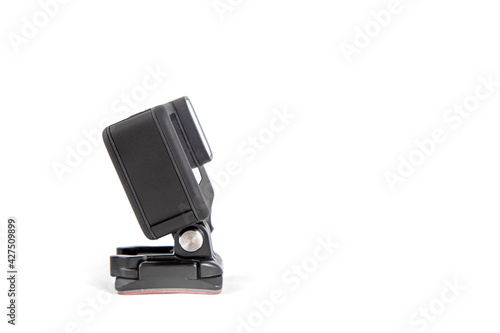 New 4K action camera on a suction mount in black color. Isolated white background