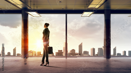 businesswoman, view, sunrise, window, suitcase, briefcase, looking, interior, morning, early, opportunity, perspective, office, leadership, employment, future, day, business, new, concept, urban, render, success, horizon, rendering, marketing, tomorrow, female, building, suit, modern, face, woman, professional, career