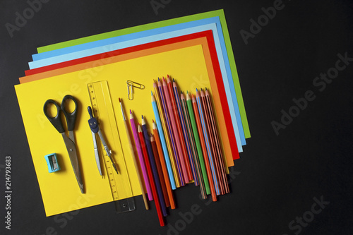 object, school, equipment, crayons, colours, colourful, paper, ruler, sharpener, bow, study, preparation, red, yellow, blue, pink, green, black, dimension, tool, draw, art