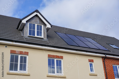 new housing roof top with solar panels. residential homes in city. property market image