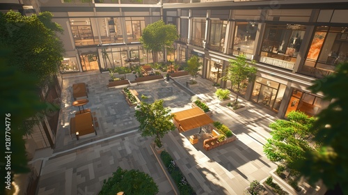 new shopping mall with modern architectural features like open courtyards and glass walls
