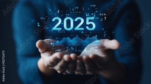 New Year projection: A futuristic 2025 hologram projected above an open hand, embodying visions of the future and technological advancement