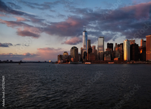 New York City skyline with urban skyscrapers over Hudson River at sunset. Manhattan downtown panorama. Waterfront view to the harbor at twilight.