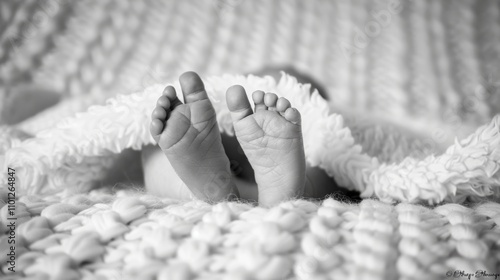 Newborn baby's delicate feet resting on a soft blanket, symbolizing the beginning of life and birth announcement, capturing the essence of new beginnings and family joy.