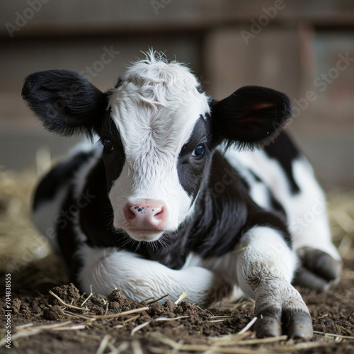 Newborn white with black calf laying on ground on livestock dairy farm, ai technology