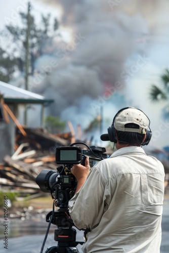 News reporters broadcasting from the scene of a natural disaster, providing critical information to viewers, Generative AI