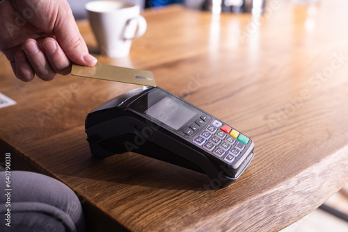NFC credit card payment. Woman paying with contactless credit card with NFC technology. Wireless money transaction. Card machine in male hand on sunlight background