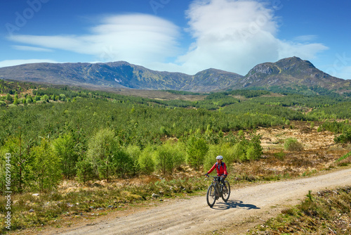 nice senior woman riding her electric mountain bike in the highlands of Glen Affric Nature reserve, Scotland, UK