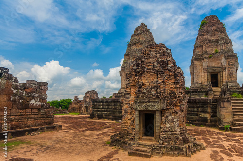 ruin, tower, hindu, sanctuary, ancient, lintel, brick, red, carved, temple, khmer, angkor, cambodia, siem reap, vacation, blue, structure, sandstone, travel, historic, unesco, front, terrace, middle, nice, elegant, view, corner, statue, lion, guardian, asia, sky, shiva, architecture, wall, tier, construction, stucco, square, platform, religion, level, tour tourism, inner