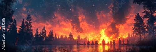 fire, lake, night, star, balefire, campfire, forest, tree, water, sky, silhouette, people, gathering, nature, landscape, dark, orange, red, warm, cold, light, shadow, calm, serene, peaceful, magical, mystical, evocative, dreamlike, artistic, digital, art, illustration, fantasy, scene, environment, atmosphere, romantic, twilight, evening