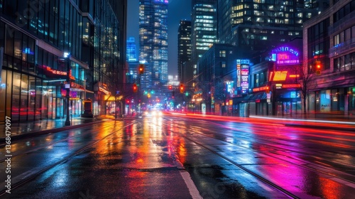 city, street, night, rain, traffic, light, skyscraper, urban, city landscape, city lights, road, downtown, city landscape, metropolis, building, reflections, wet, asphalt, evening, modern, architecture, background, transportation, travel, vibrant, colourful, energy, dynamic, tied-up, rush hour, speed, motion, blur, abstract, texture, dark, illumination, glow, neon, atmosphere, mood, scene, view, perspective, image
